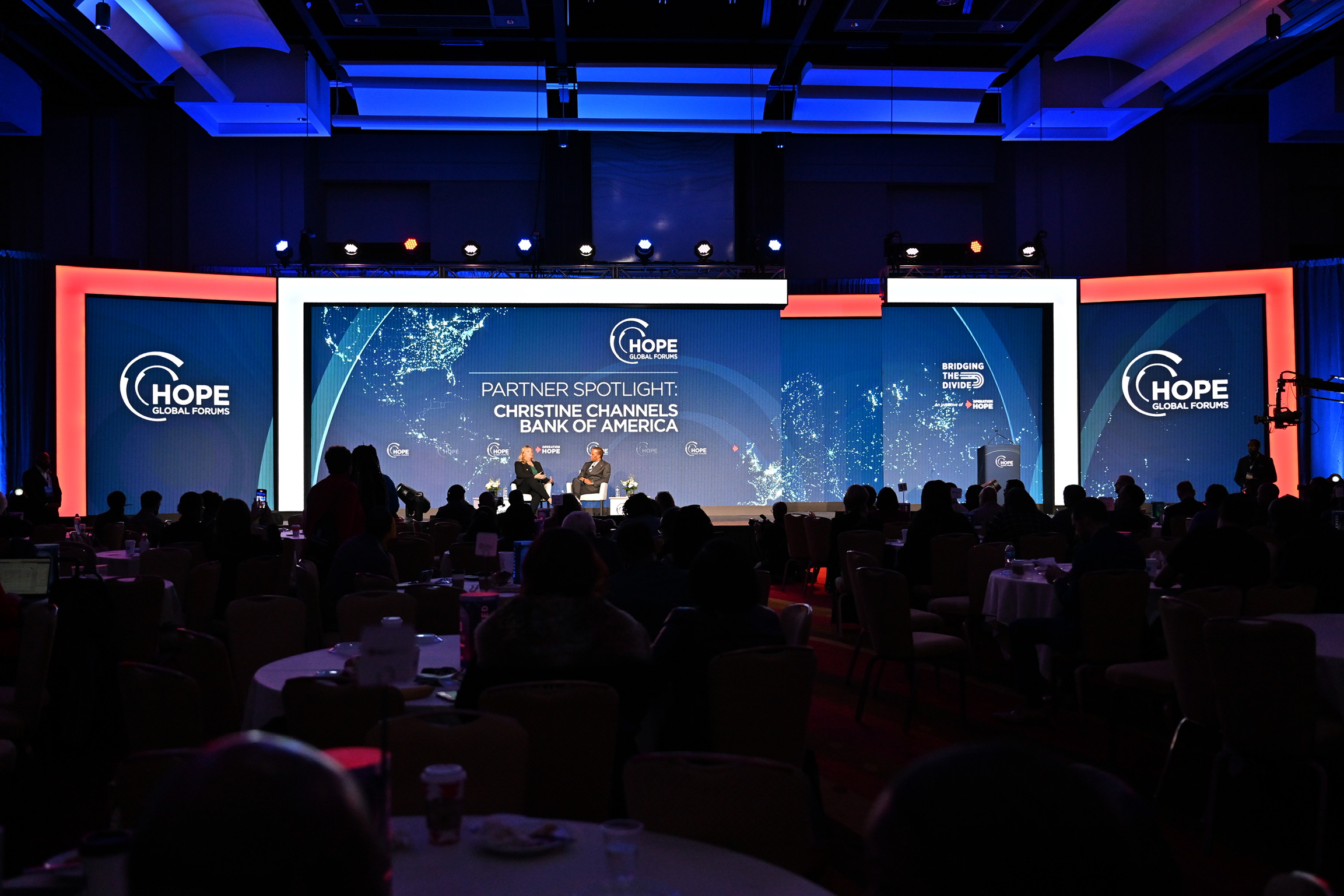 ATLANTA, GEORGIA – DECEMBER 13: Bank of America Head of Community Banking Christine Channels and Operation HOPE Chairman & CEO John Hope Bryant speak on stage during the 9th Annual HOPE Global Forums at the Hyatt Regency Atlanta on December 13, 2022 in Atlanta, Georgia. (Photo by Derek White/Getty Images for Operation HOPE, Inc.)