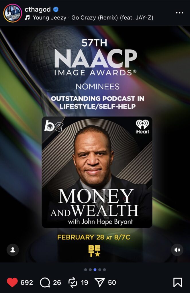 I was deeply honored to learn first from my friend Charlamagne The God (Co-Host for The Breakfast Club and CEO of The Black Effect Network, where I am honored to have a hosted podcast, and to also serve on the board) — that our podcast “Money & Wealth” has been nominated for an NAACP Image Award, for Outstanding
