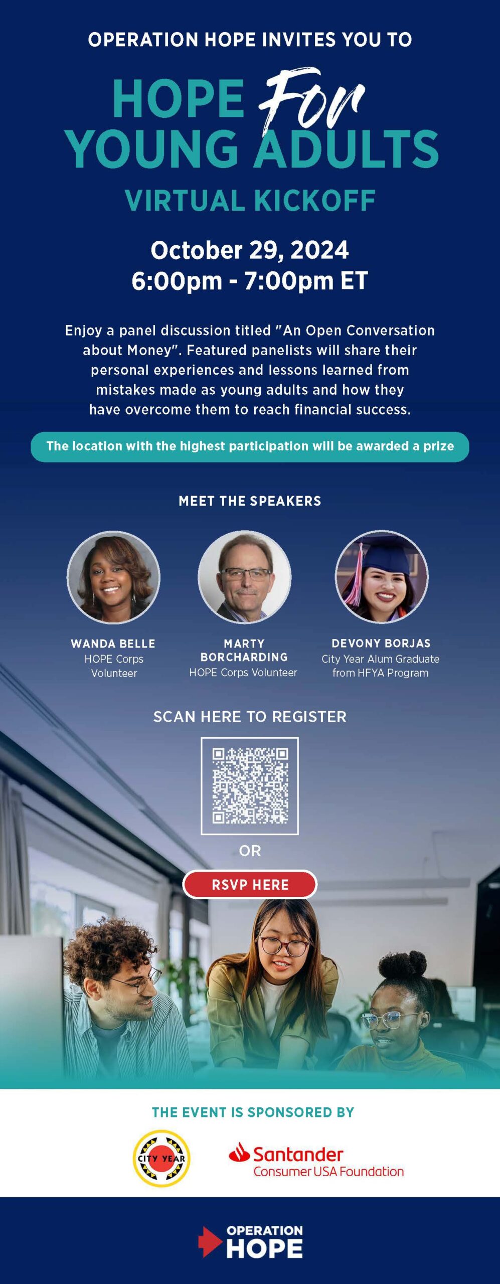 That’s why I’m thrilled to announce the kickoff of HOPE For Young Adults! This virtual event is designed to empower the next generation with the tools to make smart financial choices and build a brighter future. We’re launching with a virtual event on Tuesday, October 29, at 6 pm ET, where we’ll hold an essential panel discussion, “An Open Conversation about Money.” This is a chance to hear real stories from people who’ve been there—their wins, their lessons learned, and the stumbles they overcame on the way to financial success.